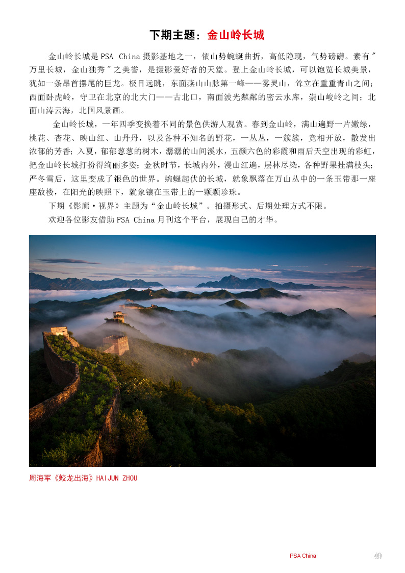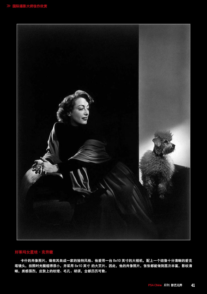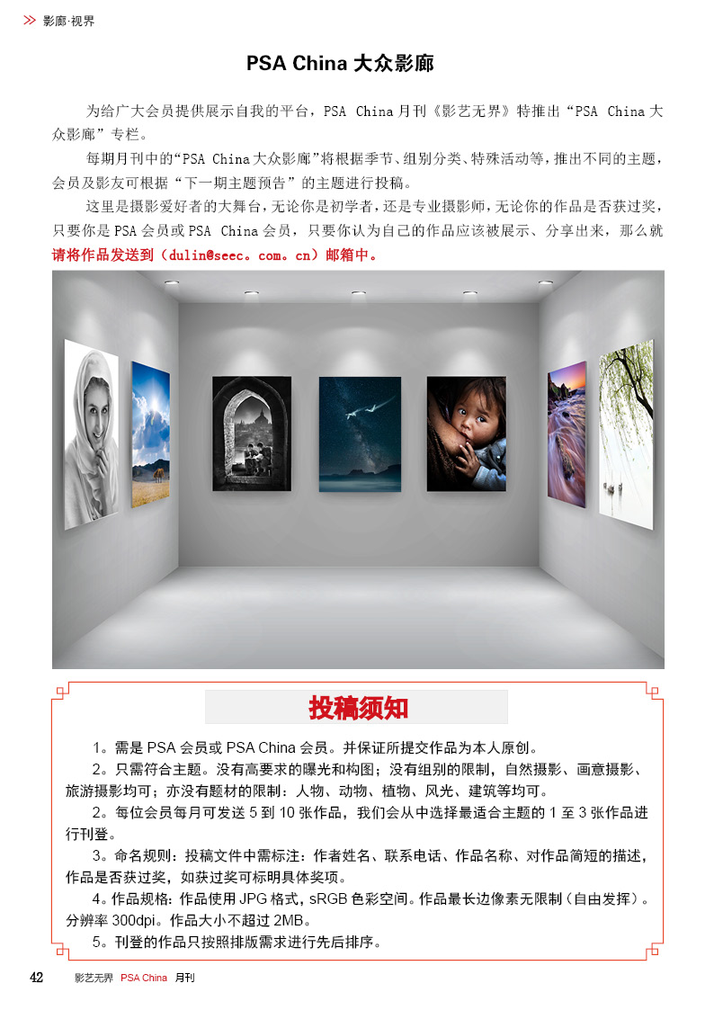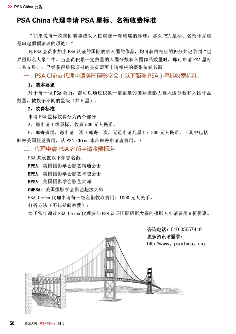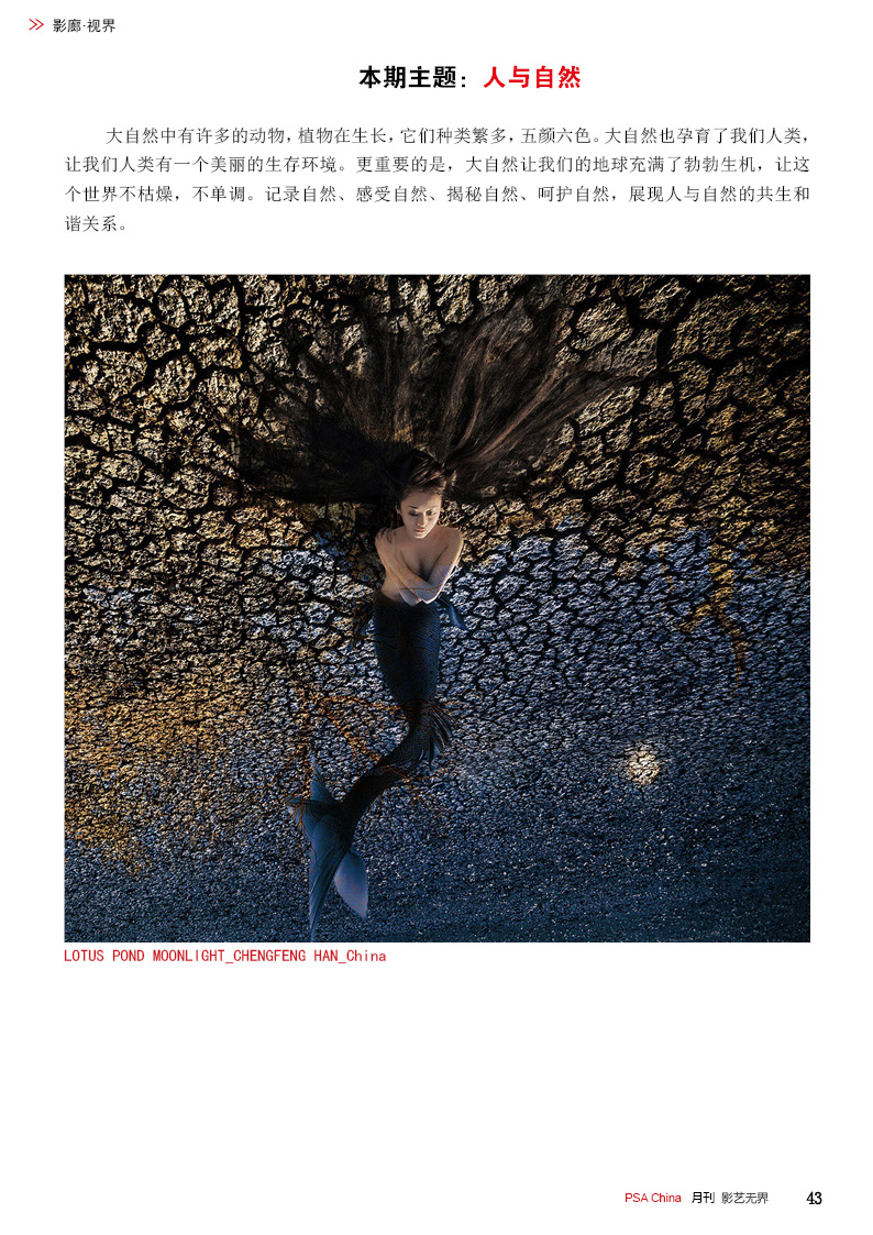 《影艺无界》2016-3月刊(总第15期)使用多个ID重复参加同一赛事,属于违规现象,有可能会受到PSA总部终身禁赛的处罚。本期月刊重点重申国际摄影赛事纪律问题。 通往世界摄影舞台的桥梁向您讲讲PSAChina国际摄影大赛的发展;此外还有大量国内外摄影作品欣赏:第七届PSAChina国际摄影大赛画意女性主题入围作品欣赏,世界顶级肖像摄影大师 约瑟夫·卡什的经典人像作品;PSA China大众影廊主题:人与自然。