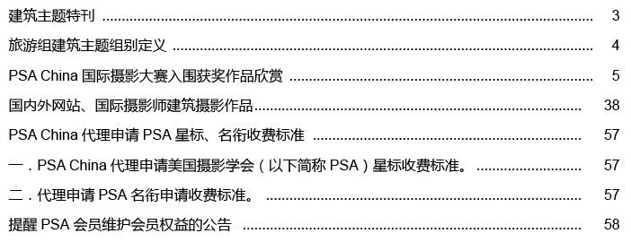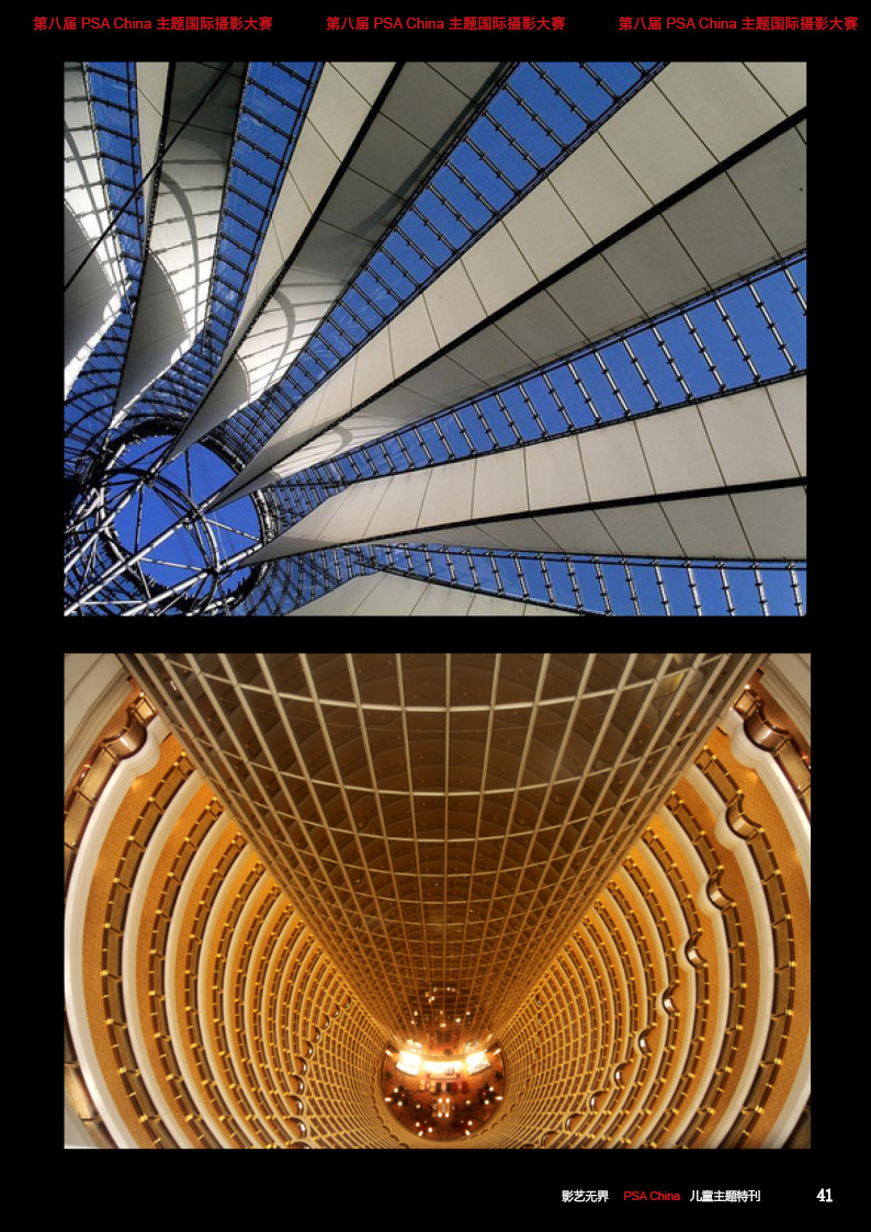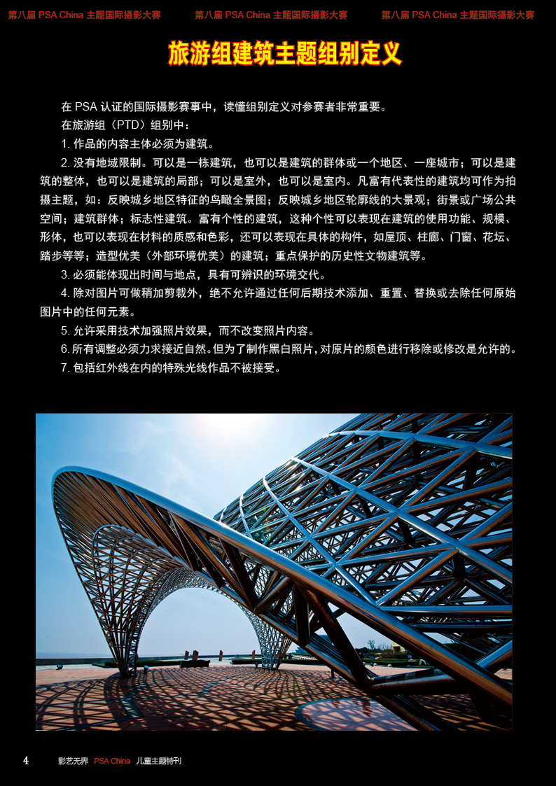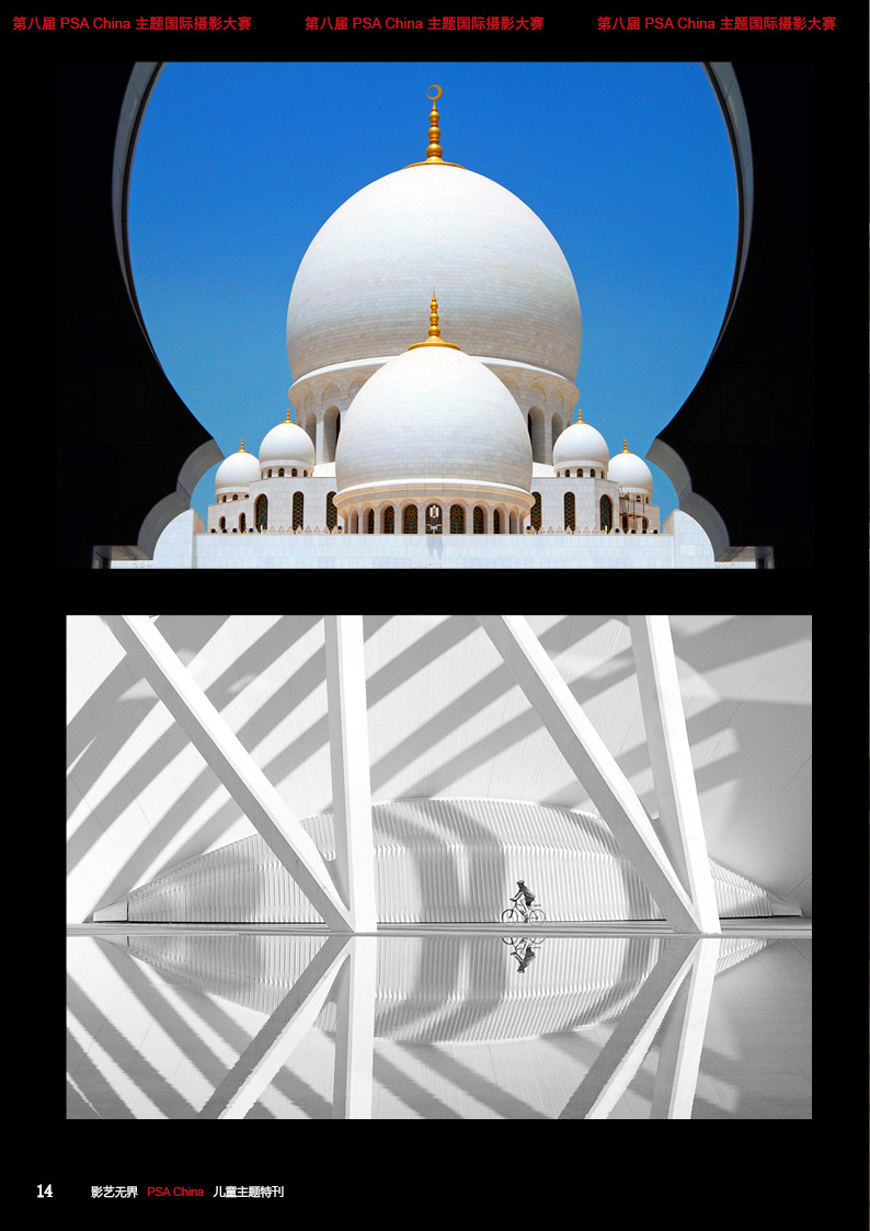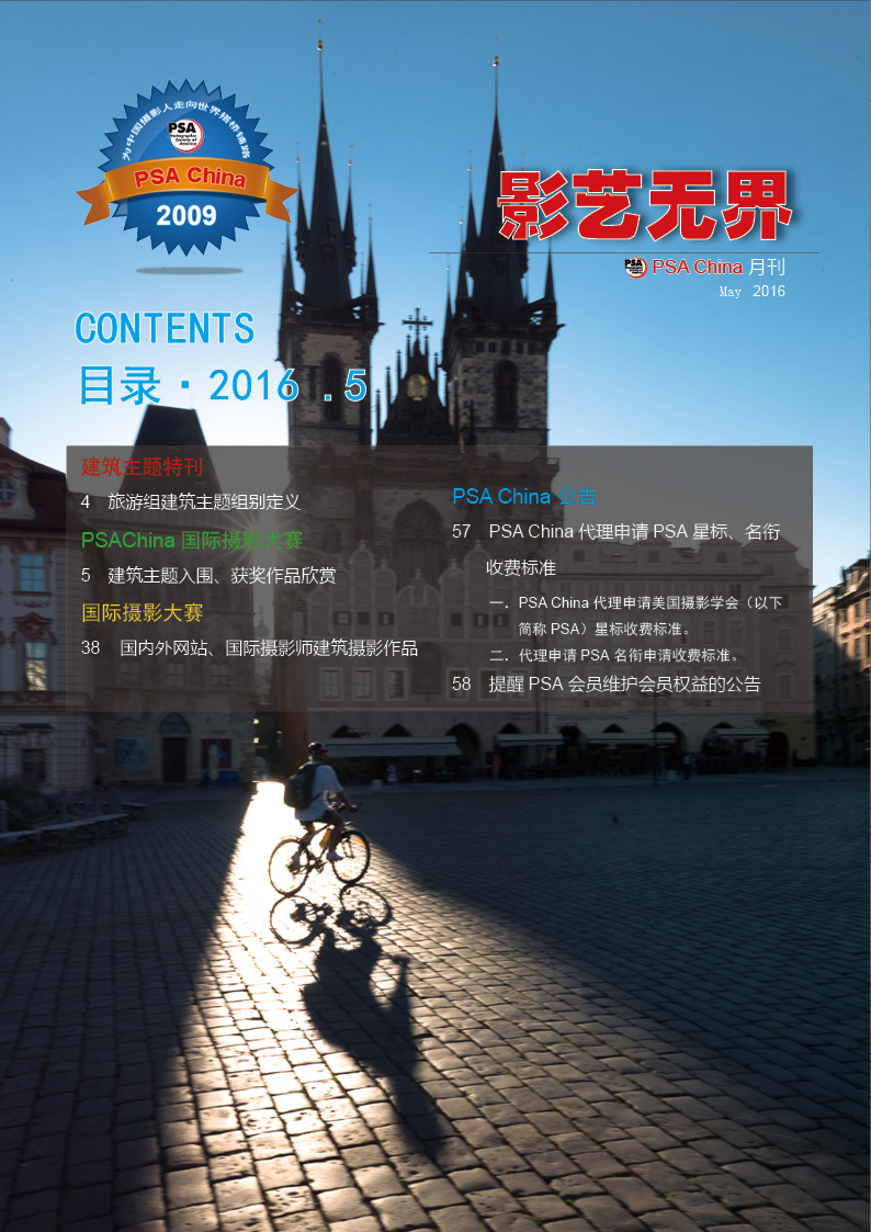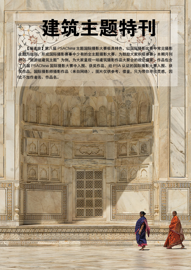 《影艺无界》2016-5月刊(总第17期)第八届PSAChina主题国际摄影大赛极具特色,以国际摄影比赛中常见摄影主题为组别,形成国际摄影赛事中少有的全主题摄影大赛。为鼓励大家积极参赛,本期月刊特以“旅游组建筑主题”为例,为大家呈现一场建筑摄影作品大聚会的视觉盛宴。作品包含了历届PSAChina国际摄影大赛中入围、获奖作品,经PSA认证的国际摄影大赛入围、获奖作品,国际摄影师摄影作品(来自网络)。图片仅供参考、借鉴,只为带你寻找灵感,因此不加作者名、作品名。