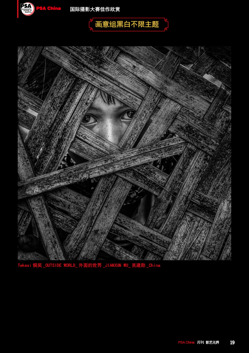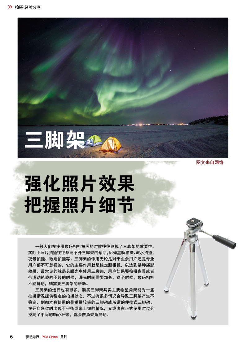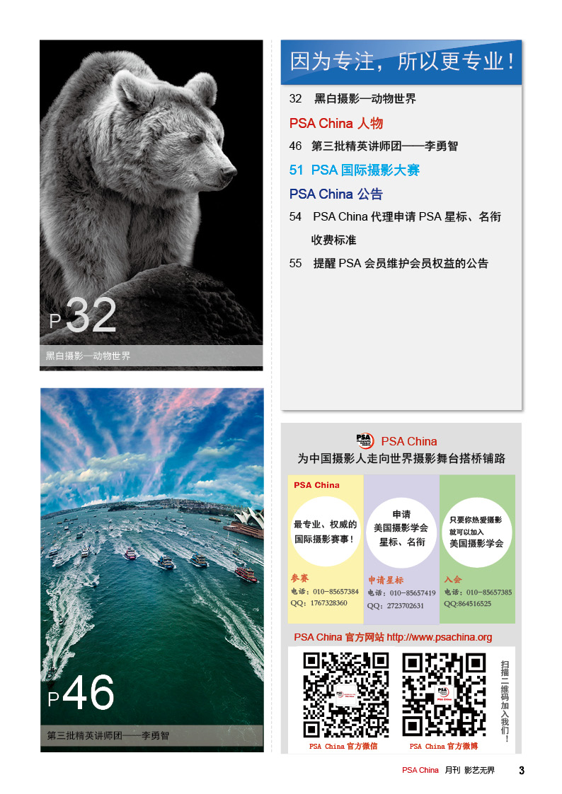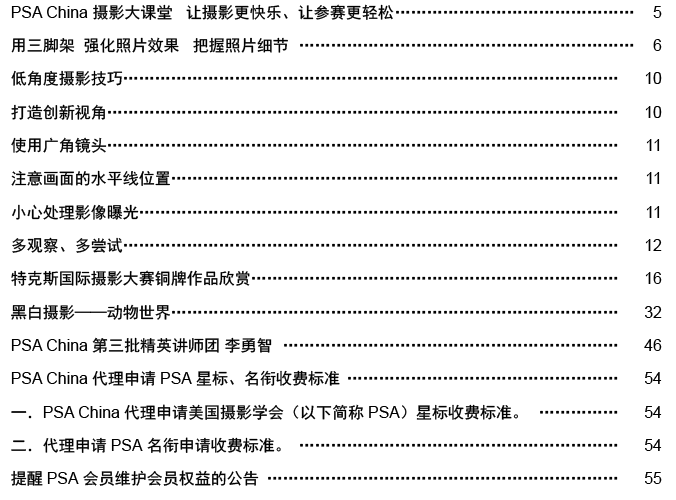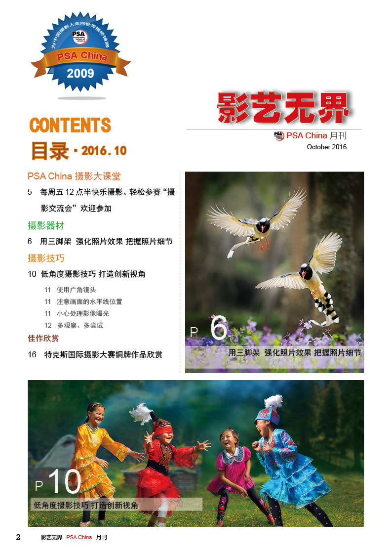 《影艺无界》2016-10月刊(总第22期)三脚架的作用无论是对于业余用户还是专业用户都不可忽视的,用三脚架可以强化照片效果,把握照片细节;想要在众多国际摄影比赛中脱颖而出,抓住评委第一眼的感觉很重要,本期摄影技巧栏目跟大家聊聊通过低角度拍摄,可为观众带来视觉冲击感,为你的摄影带来全新的感觉。 此外,还有特克斯国际摄影大赛铜牌作品欣赏、 黑白摄影——动物世界作品欣赏。本期PSA China第三批精英讲师团介绍的是,中国新锐摄影师之——李勇智。