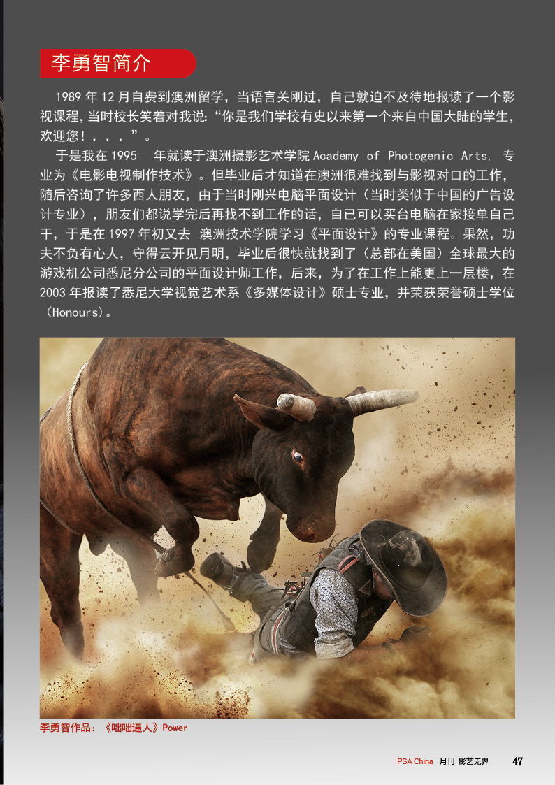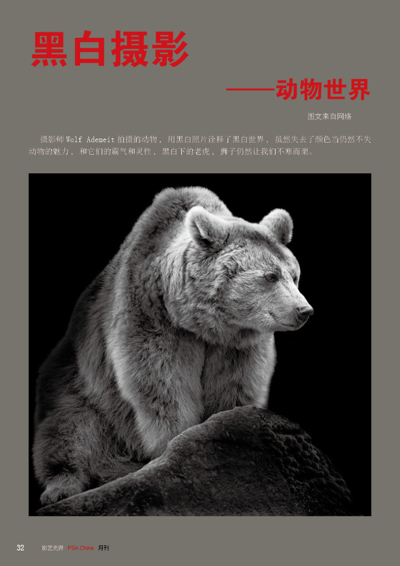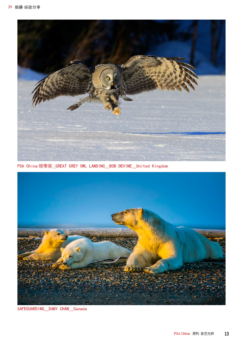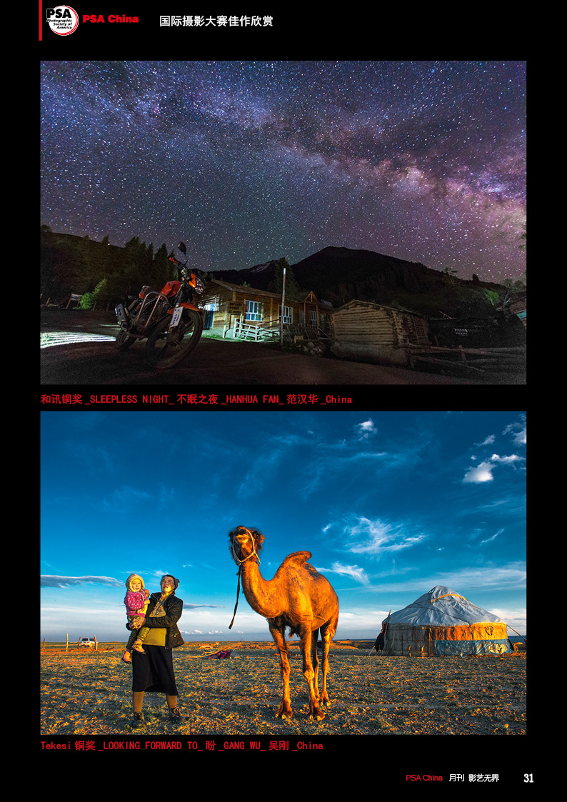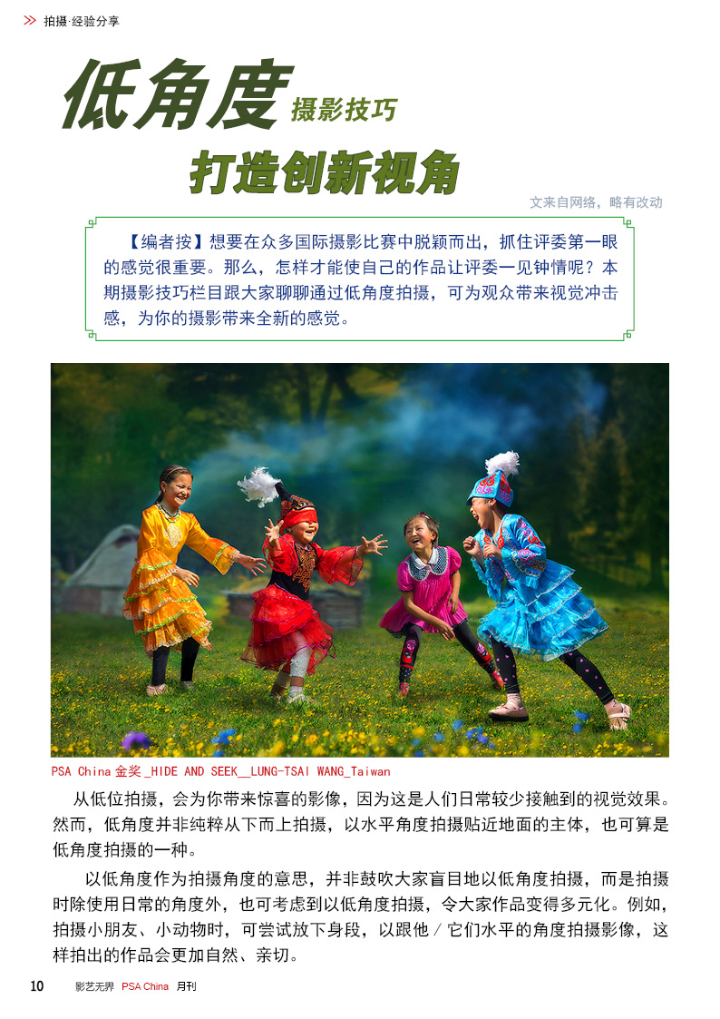 《影艺无界》2016-10月刊(总第22期)三脚架的作用无论是对于业余用户还是专业用户都不可忽视的,用三脚架可以强化照片效果,把握照片细节;想要在众多国际摄影比赛中脱颖而出,抓住评委第一眼的感觉很重要,本期摄影技巧栏目跟大家聊聊通过低角度拍摄,可为观众带来视觉冲击感,为你的摄影带来全新的感觉。 此外,还有特克斯国际摄影大赛铜牌作品欣赏、 黑白摄影——动物世界作品欣赏。本期PSA China第三批精英讲师团介绍的是,中国新锐摄影师之——李勇智。