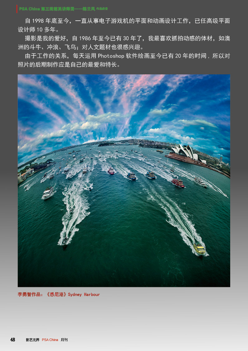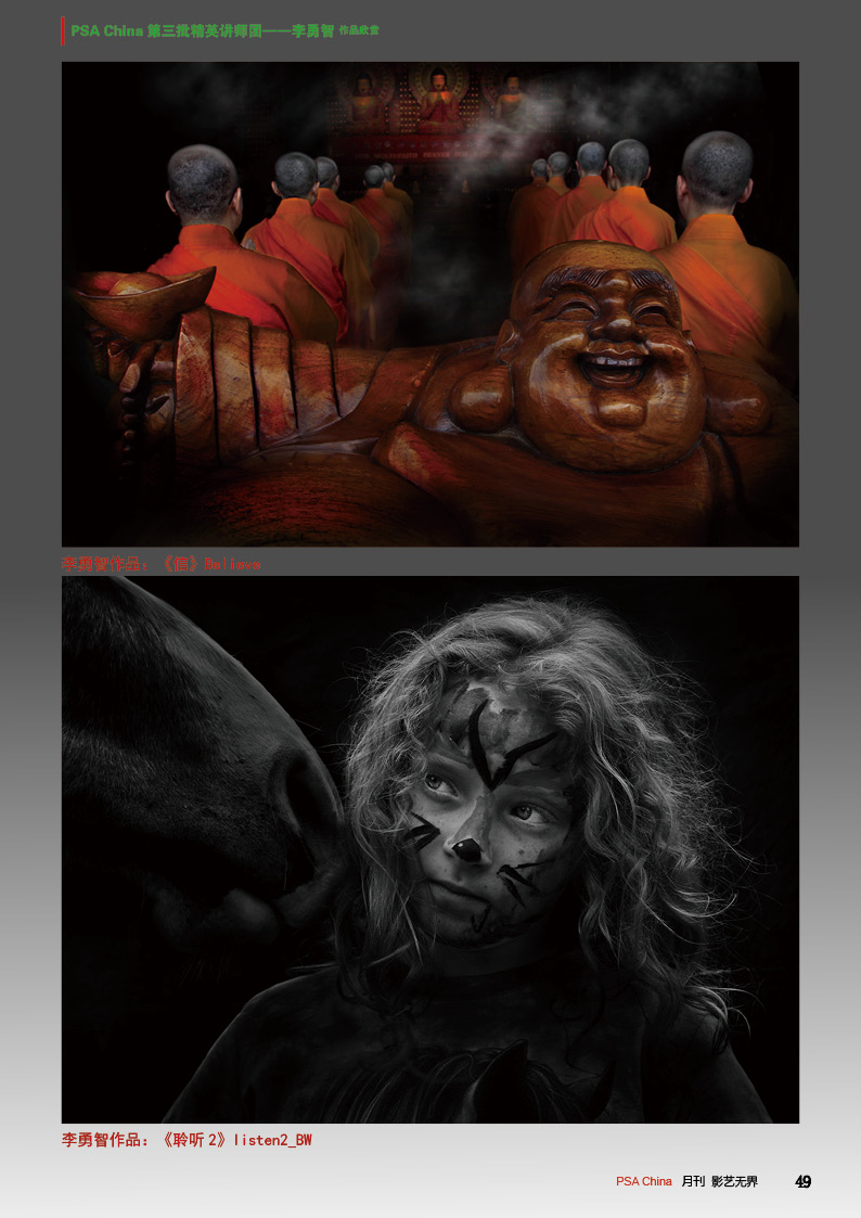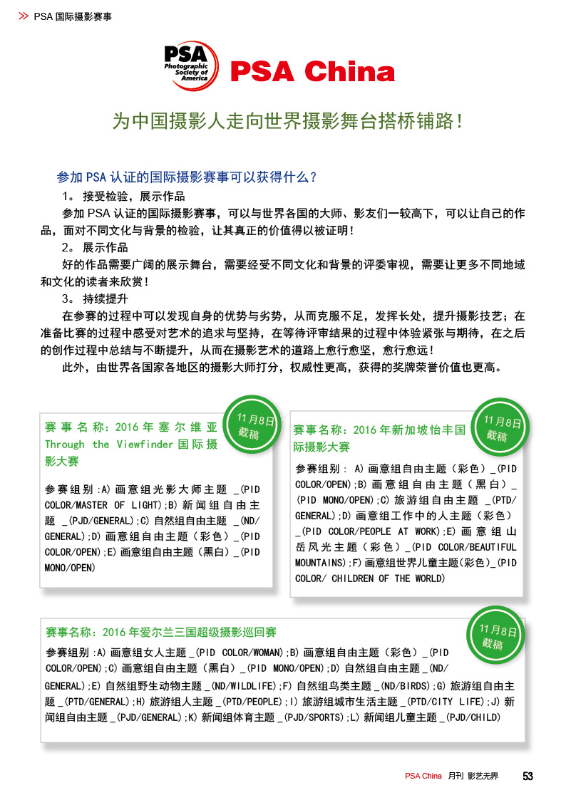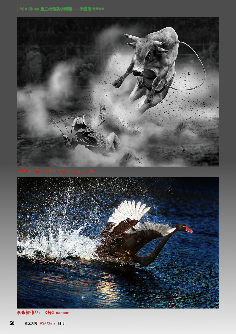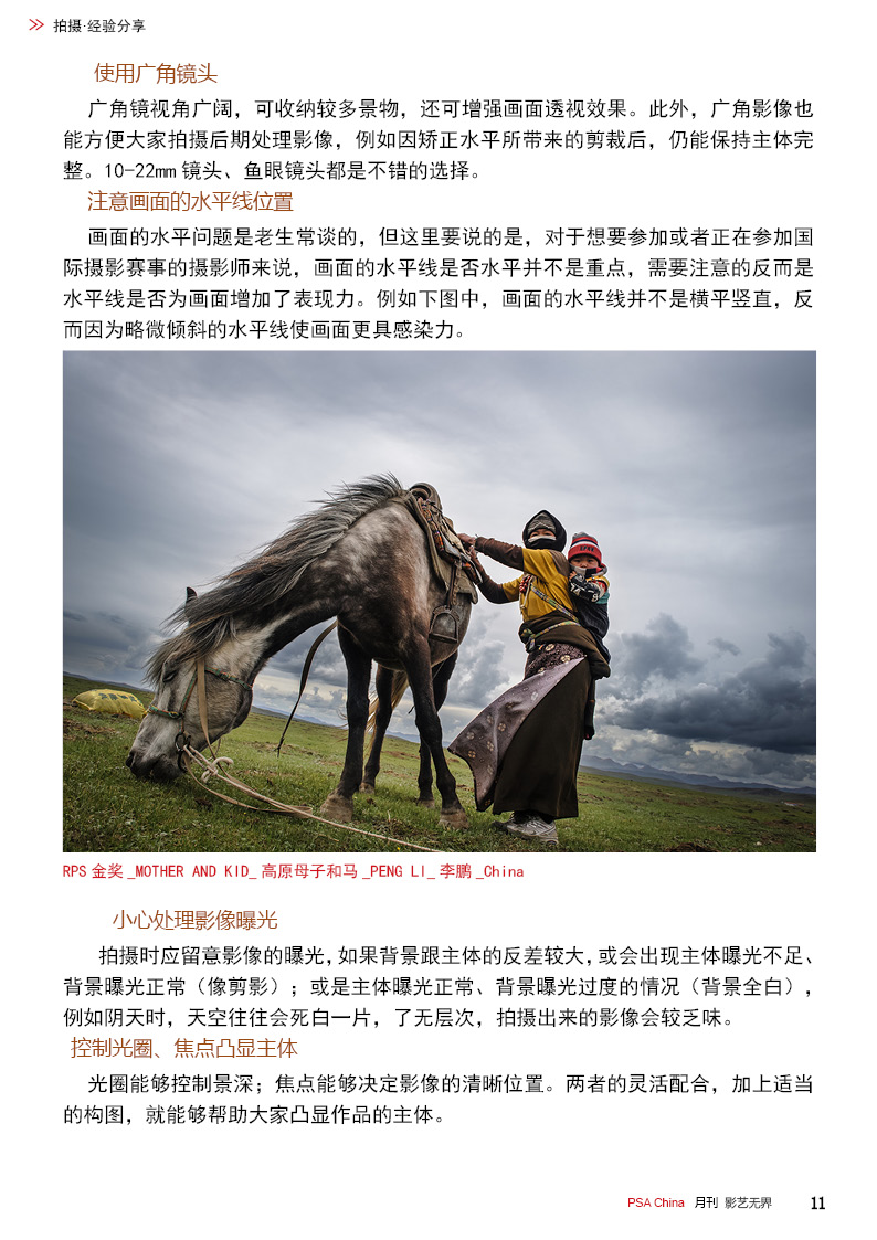 《影艺无界》2016-10月刊(总第22期)三脚架的作用无论是对于业余用户还是专业用户都不可忽视的,用三脚架可以强化照片效果,把握照片细节;想要在众多国际摄影比赛中脱颖而出,抓住评委第一眼的感觉很重要,本期摄影技巧栏目跟大家聊聊通过低角度拍摄,可为观众带来视觉冲击感,为你的摄影带来全新的感觉。 此外,还有特克斯国际摄影大赛铜牌作品欣赏、 黑白摄影——动物世界作品欣赏。本期PSA China第三批精英讲师团介绍的是,中国新锐摄影师之——李勇智。