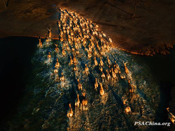 陆平画意彩色组不限主题作品:《群鹿抢渡》Group deer crossing the river